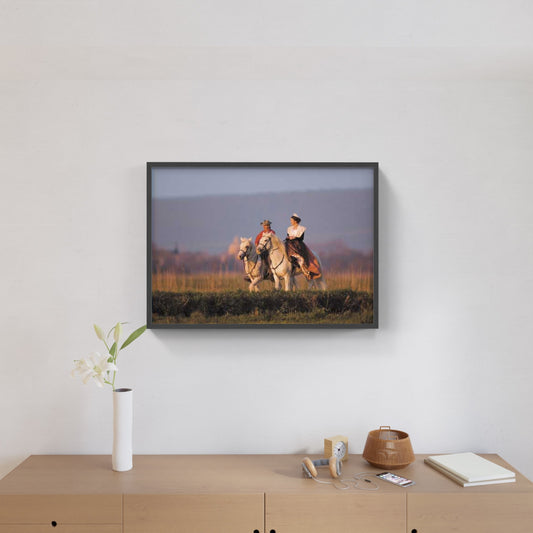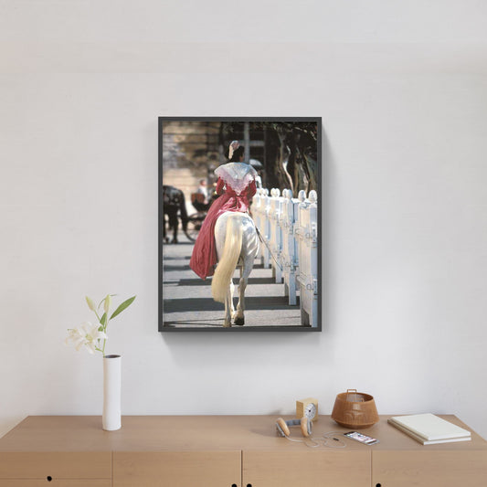 Affiche : "Arlésienne en robe fuchsia en amazone sur un cheval Camargue" de Gilles MARTIN-RAGET