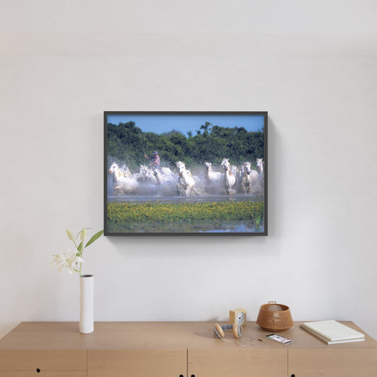 Affiche : "Chevaux Camargue galopant dans l'eau avec un gardian" de Gilles MARTIN-RAGET
