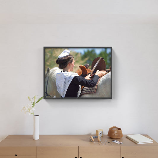 Affiche : "Reine d'Arles sellant son cheval Camargue" de Gilles MARTIN-RAGET